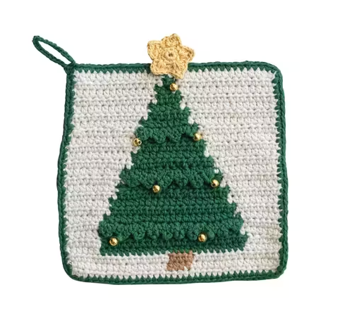 8" Square Cotton Crocheted Pot Holder with Christmas Tree & Beads