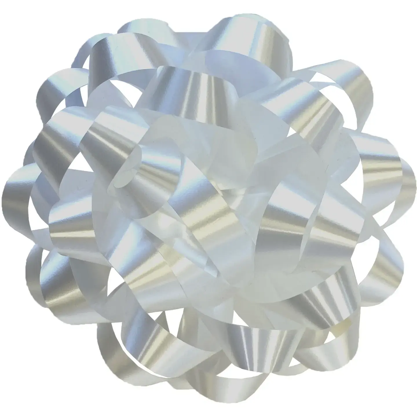 This White Poly bow is a 5". It is self adhesive with no hang tab.