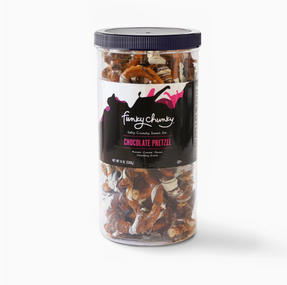 This tall, re-sealable canister of popcorn and pretzel mixes are our most popular size and makes a great office party favor, hostess or business gift.