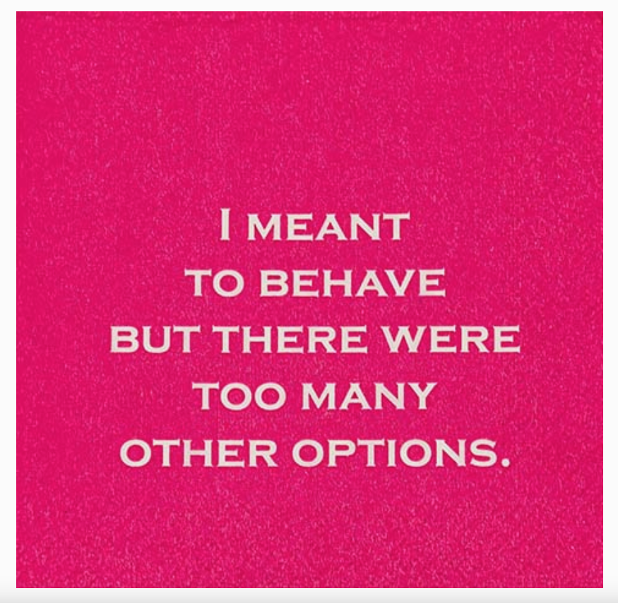 "I Meant To Behave But There Were Too Many Other Options" cocktail napkin is perfect for your next girls’ night or cocktail party! Here's To Breaking All The Rules! this pairs well with just about any decor theme. Both women and men love this witty saying. You can also pair this little number with a bottle of wine for a most coveted hostess gift!! Each pack contains 20 5 x 5 three-ply cocktail napkins *super thick* packaged in polypropylene.