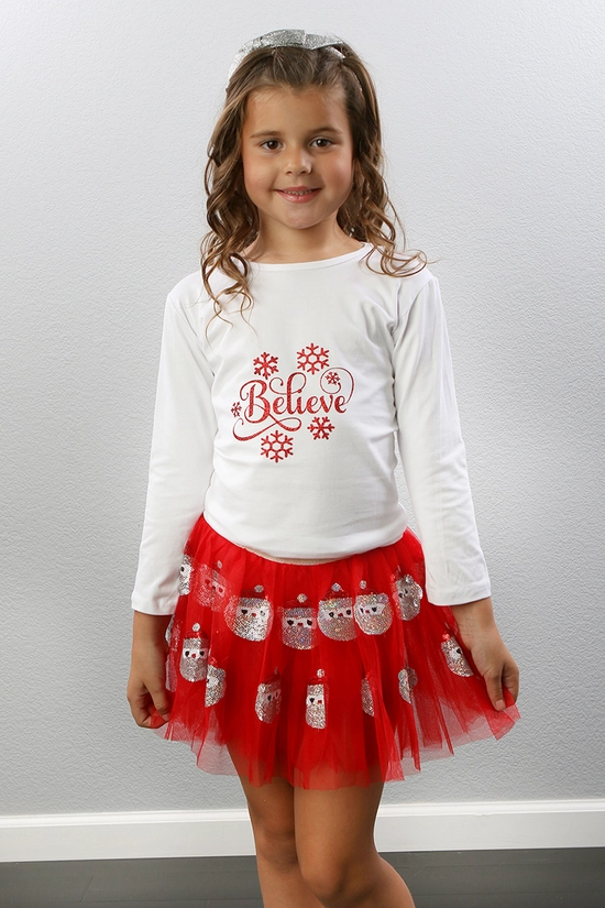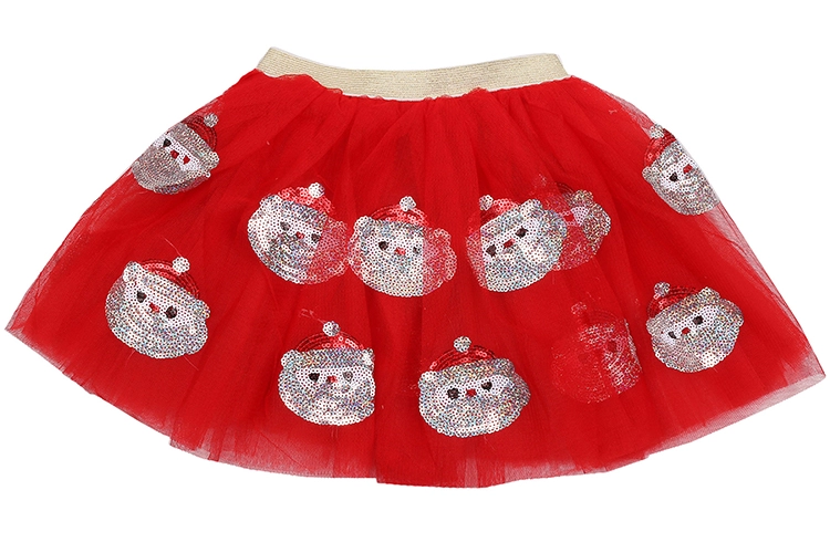 Red Tulle with embroidered Santa faces, lined, with glitter waistband. Size 2-6.