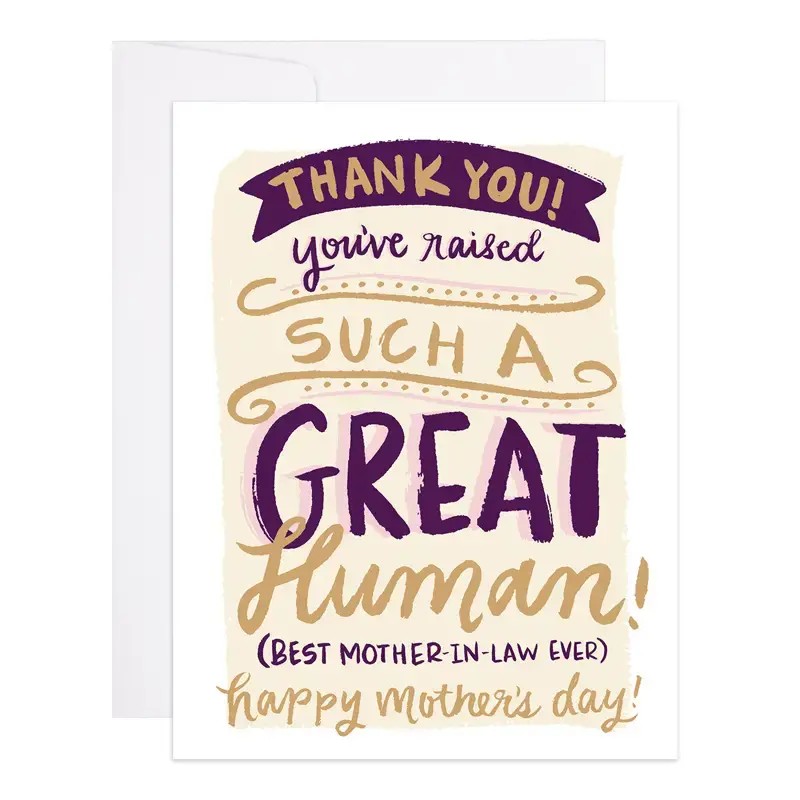 Thank You Mother-in-Law is hand illustrated, digitally printed + gold foil pressed, printed with lots of care on natural white cover stock. Blank interior + matching envelope. Individually packaged. A2 (4.25 x 5.5)