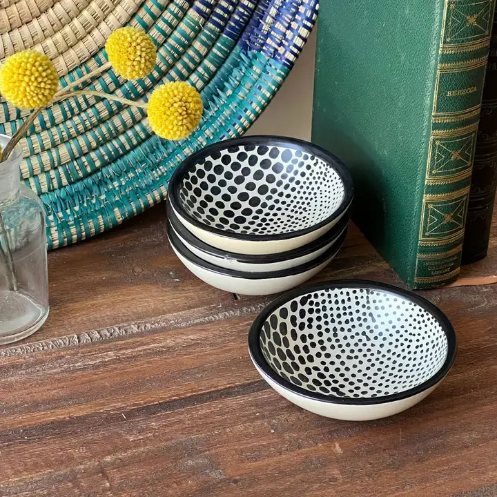Hand-carved from a single piece of Kisii soapstone by African artisans, each dish is uniquely handmade. The artist painted simple tribal designs to form a modern bowl that can go with any decor. Perfect dish for jewelry or other small items. Makes a great, ethical gift. P
