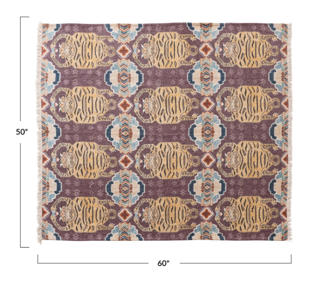60"L x 50"W Cotton Slub Printed Throw w/ Tibetan Tigers Pattern & Fringe, Multi Color