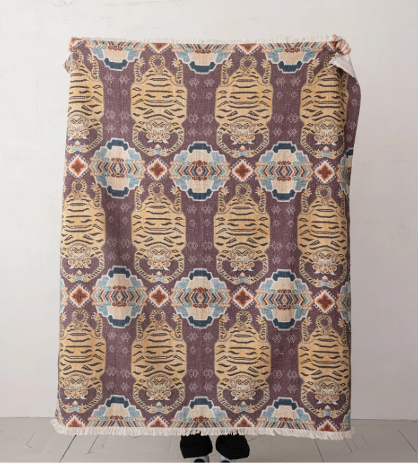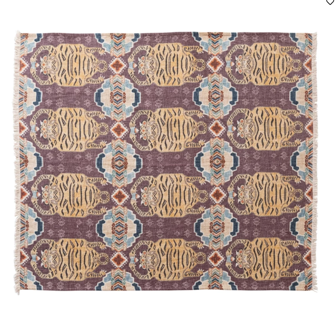 Cotton Slub Printed Throw w/ Tibetan Tigers Pattern & Fringe