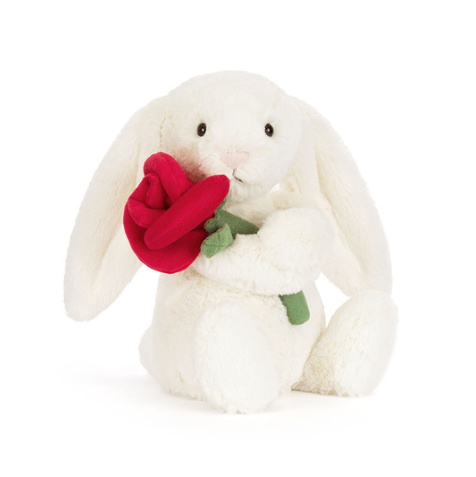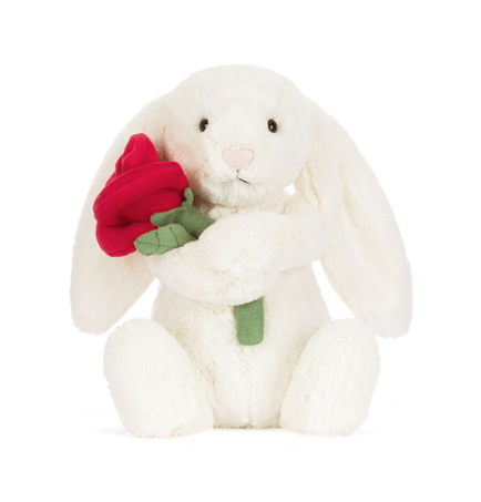 Calm, un-rushable Cream Bunny with Rose takes the time to notice the beauty all around her.
