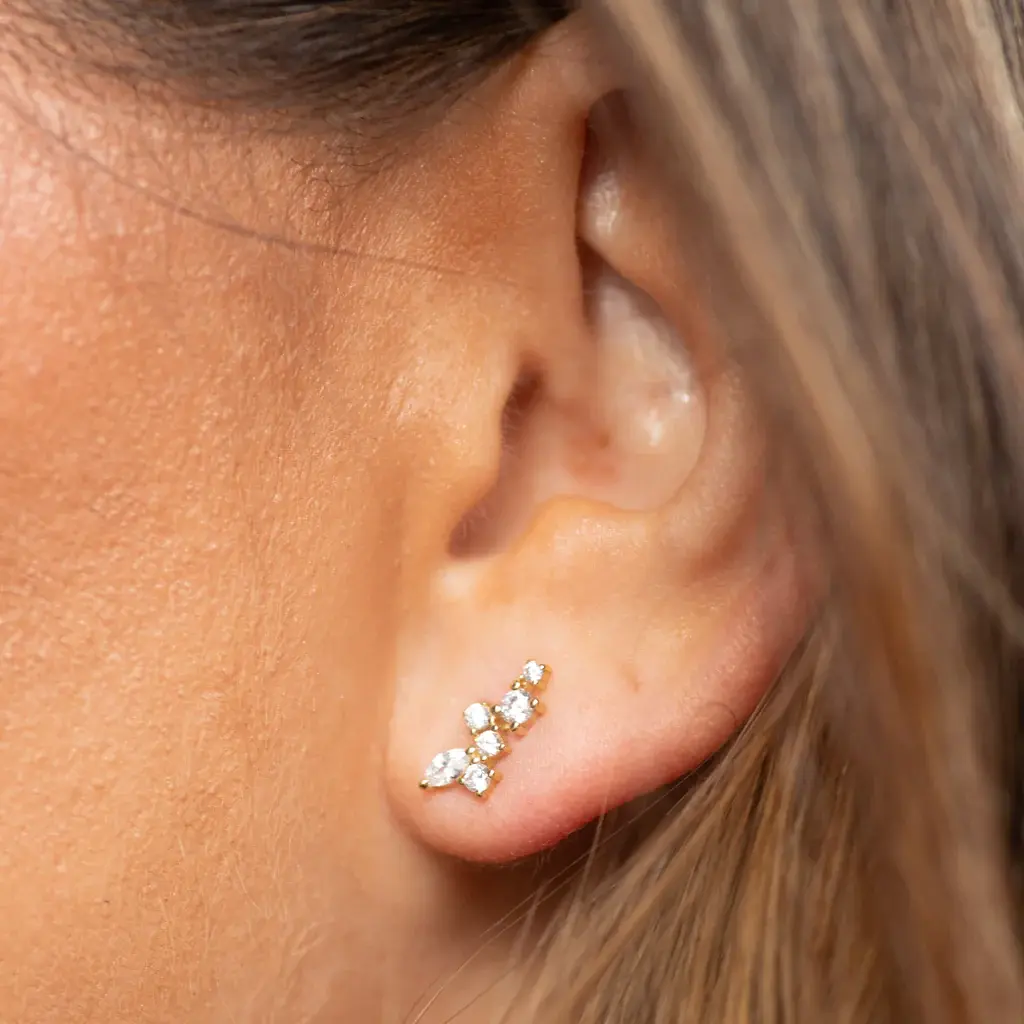 An elevated everyday earring with a playful twist, perfect for both casual moments and special occasions. Featuring a chic ear crawler design with a curved cluster of sparkle, it’s a versatile piece that adds just the right touch of glam.