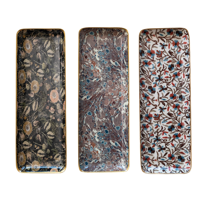 Enameled Metal Tray w/ Pattern & Gold Rim, 3 Styles