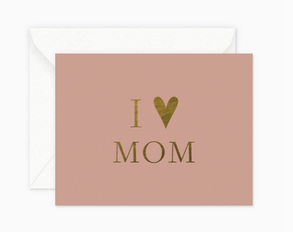 This I Heart Mom card is printed with foil stamping on luxe heavyweight textured cardstock. Gold foil on dusty rose paper. Show mom some love.