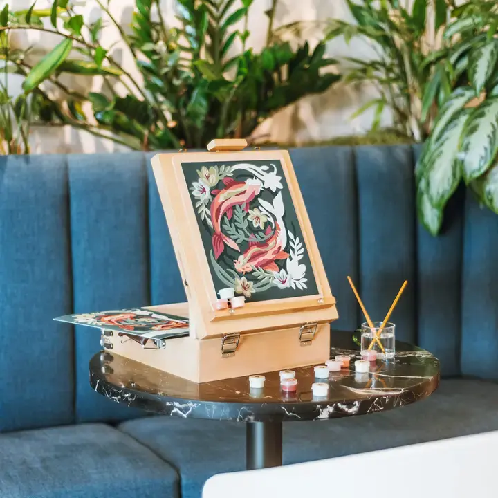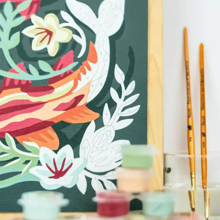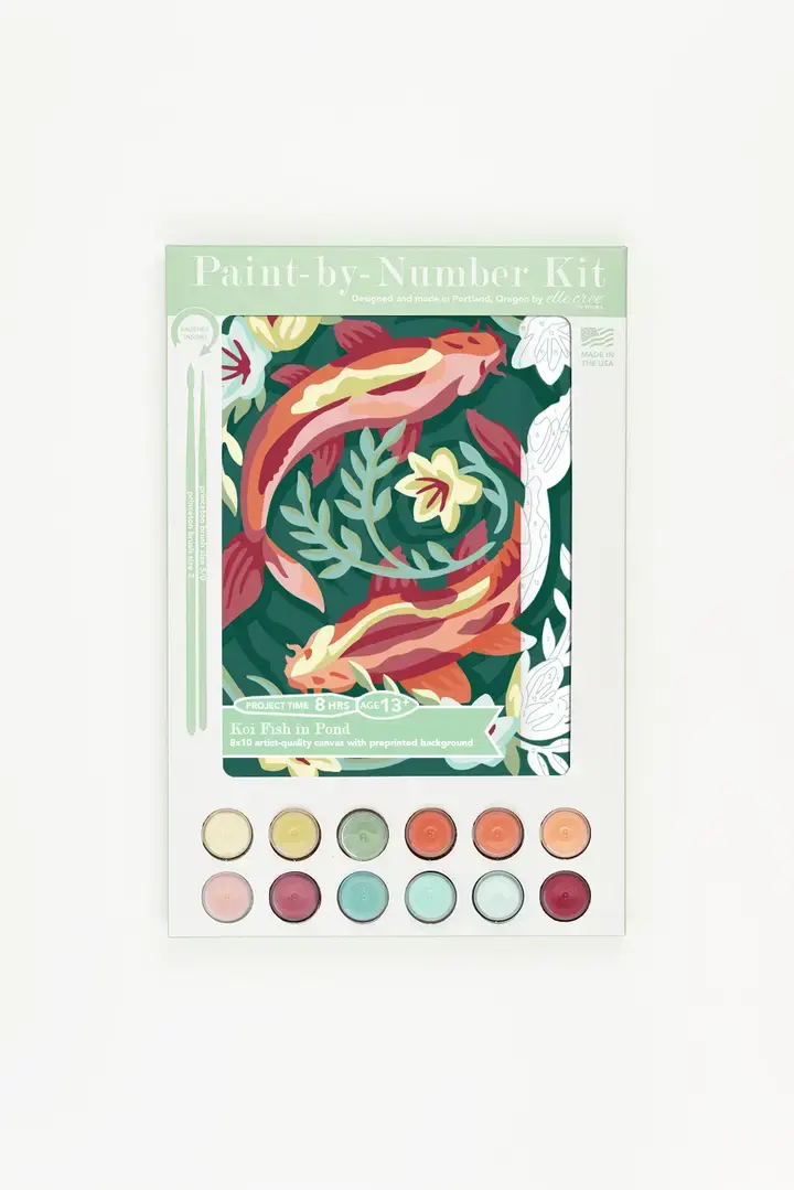 Koi Fish in Pond features two stylized carp in a pool of water swirling with lily flowers and vines. The pre-printed background features a deep green pool. Completing the acrylic painting can take 8+ hours. When completed, select a frame at your local craft store and display your new handmade home decor! This DIY craft is recommended for adults and teens age 13 and up. Contents: (1) 8x10 artist-quality, un-mounted canvas with pre-printed background, (12) American-made acrylic paints *, (2) Princeton brush paintbrushes, instructions