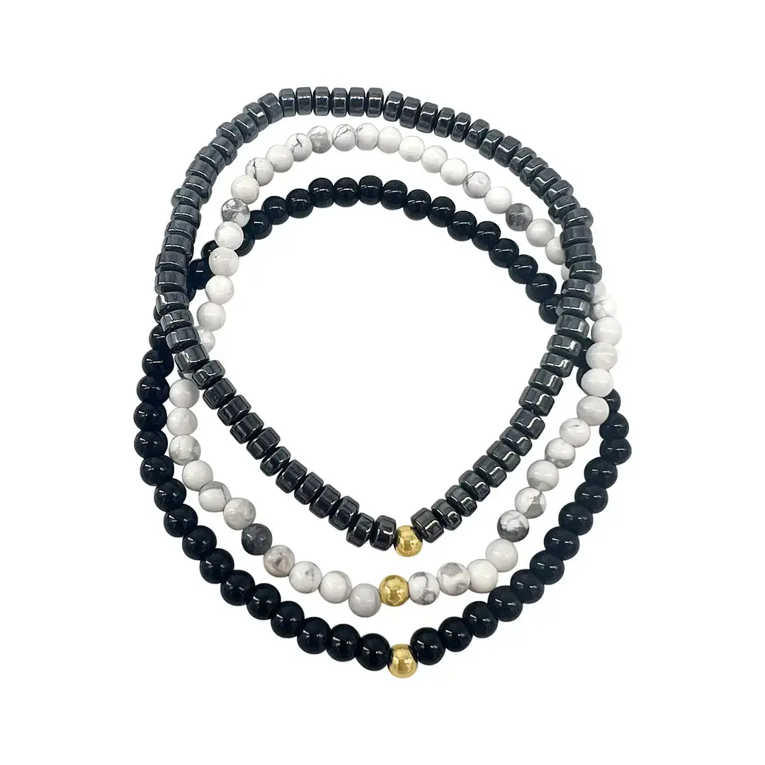 Men's Triple Stretch Bead Bracelet Set White, Black, Silver