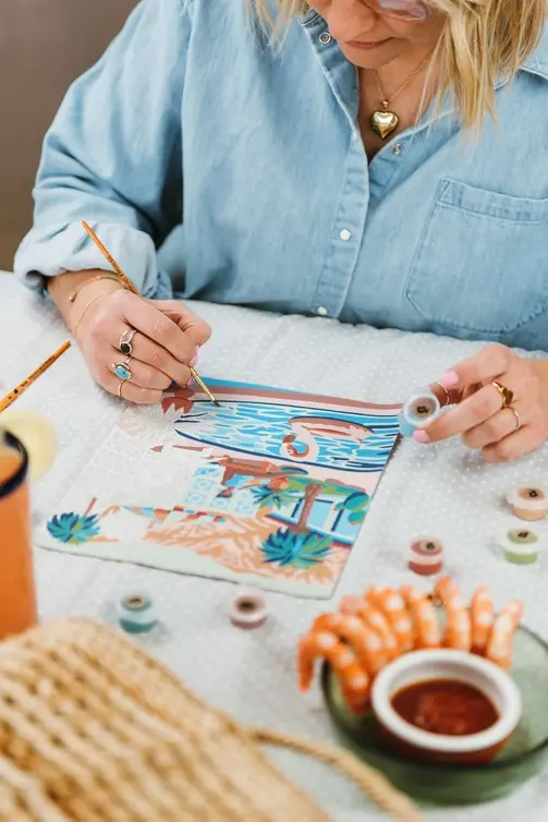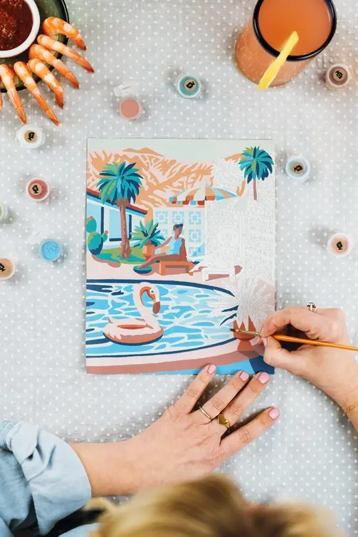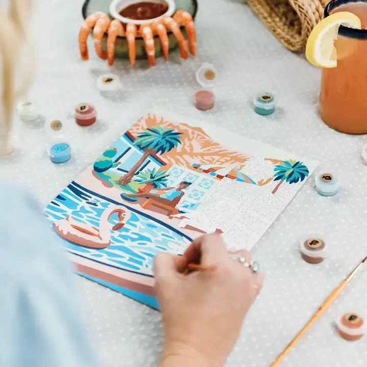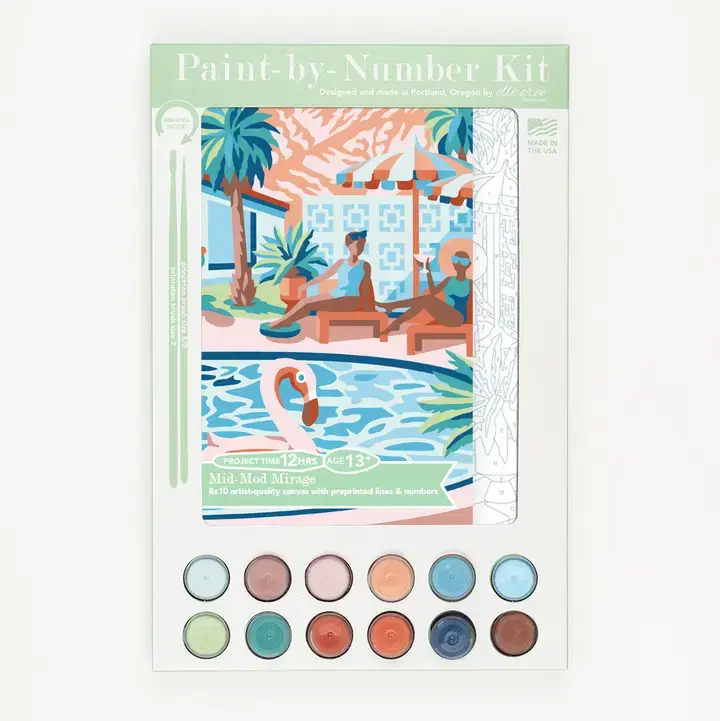 Mid-Mod Mirage paint-by-number kit features the retro elegance of a Palm Springs-inspired poolside escape including a mid-century ranch and breezy palm trees just beyond the breeze block.
