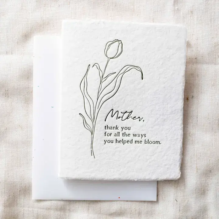 Our handmade deckled edge paper collection is letterpress printed in-house late at night with lots of coffee. This card is meant to be treasured for years to come. Handmade paper beautiful enough to frame and helps us ensure there was no slave labor in our supply chain.