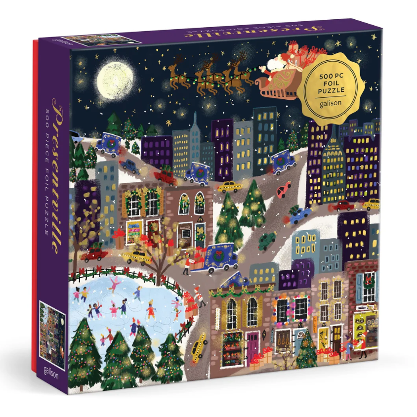 Immerse yourself in Joy Laforme's festive Presentville 500 Piece Foil Puzzle, featuring a meticulously illustrated holiday-themed cityscape. The premium foil accents illuminate the seasonal urban scene, highlighting twinkling lights, snow-dusted buildings, and celebratory details with sophisticated reflective qualities. This expertly crafted puzzle offers a moderate challenge with precision-cut pieces that provide a satisfying assembly experience for dedicated puzzlers seeking both artistic merit and seasonal charm.