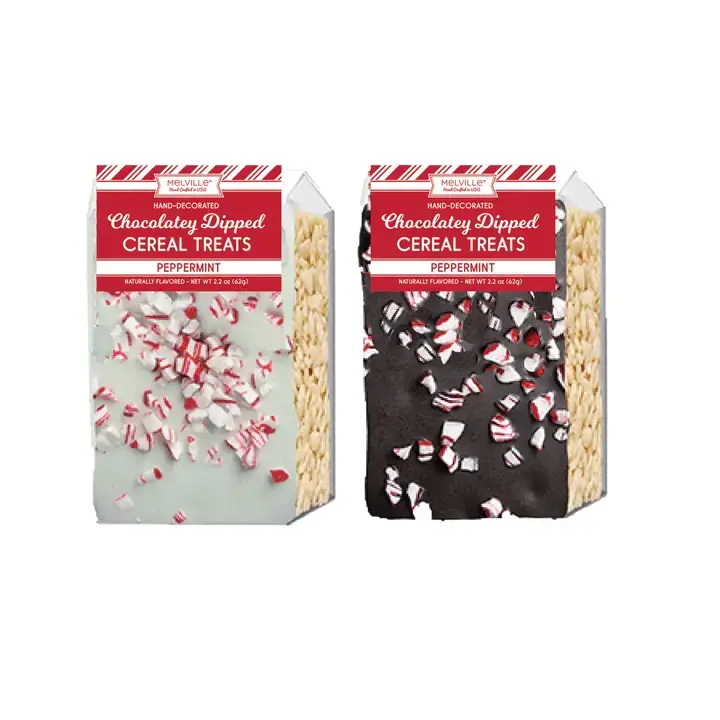 These yummy treats are rice cereal treats coated with chocolate and sprinkled with peppermint bits. Each treat is hand-crafted; slight variations will occur.