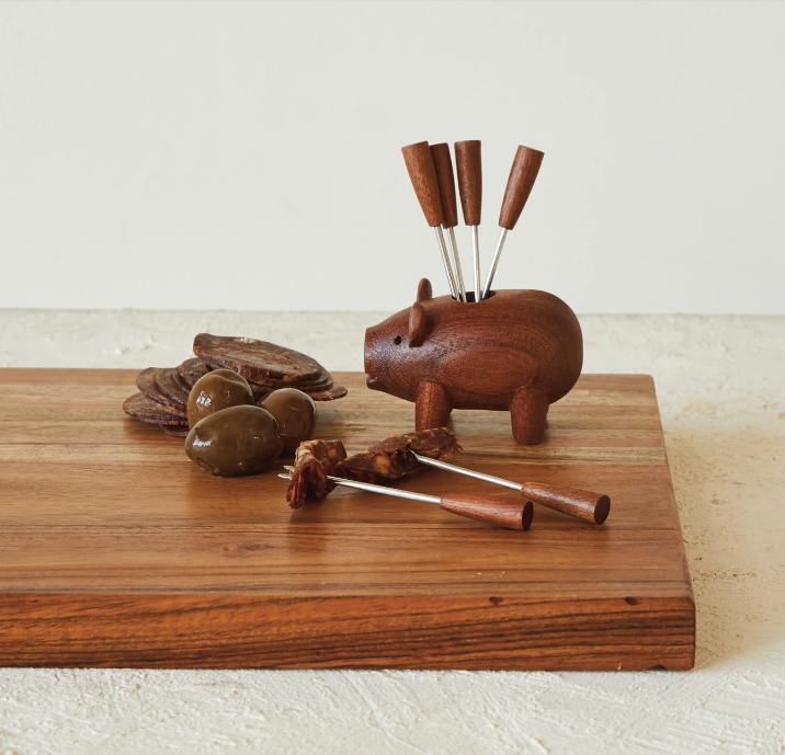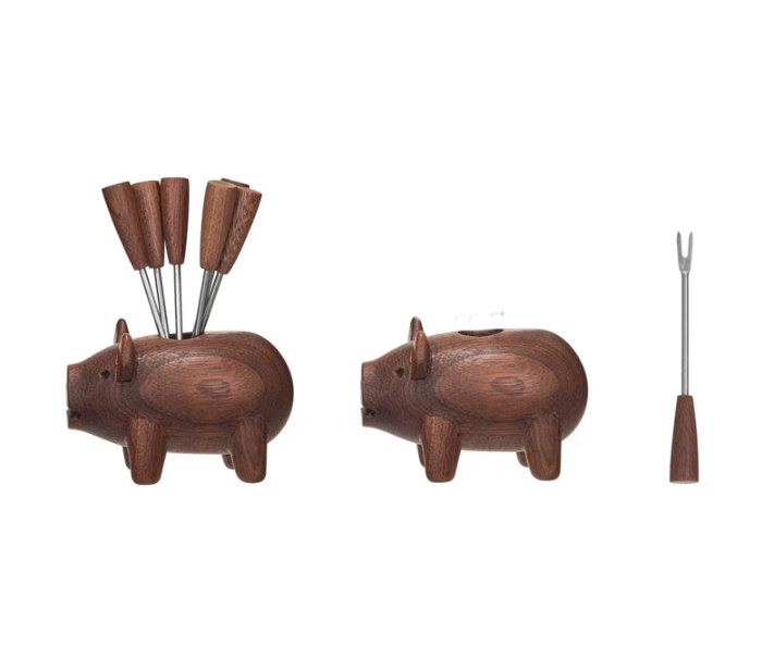 Sapele Wood Pig Shaped Holder w/ 6 Appetizer Forks, Set of 7