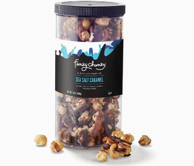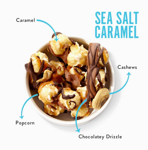 This tall, re-sealable canister of popcorn and pretzel mixes are our most popular size and makes a great office party favor, hostess or business gift. Sea Salt Caramel - Caramel popcorn made with real butter and brown sugar covered in gooey caramel, a dash of sea salt, roasted cashews & a drizzle of milk and dark chocolatey goodness.