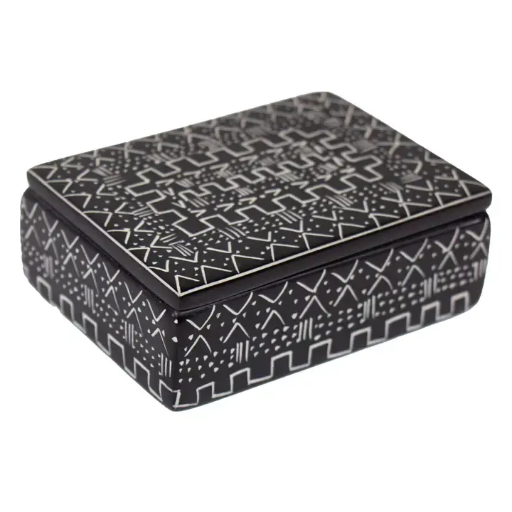 Hand-carved from Kisii soapstone by African artisans, each box is uniquely handmade. The craftsmanship is superb. The base is carved from a single piece of stone, as is the top. Each piece is hand-painted and then etched with elegant tribal designs.