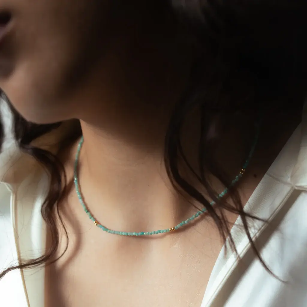 Add a touch of elegance to your look with this Amazonite choker necklace, featuring soft blue-green hues and subtle golden accents. Amazonite known as the stone of courage and truth, Amazonite soothes the spirit and empowers you to express your inner voice with confidence and calm.