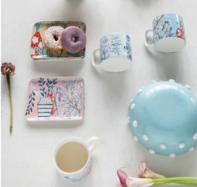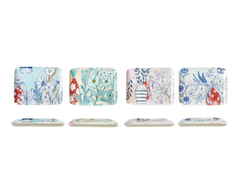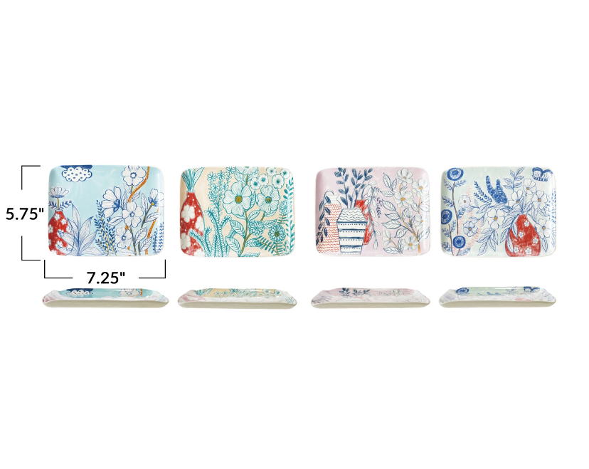 7-1/4"L x 5-3/4"W Stoneware Plate w/ Flowers, Multi Color, 4 Styles