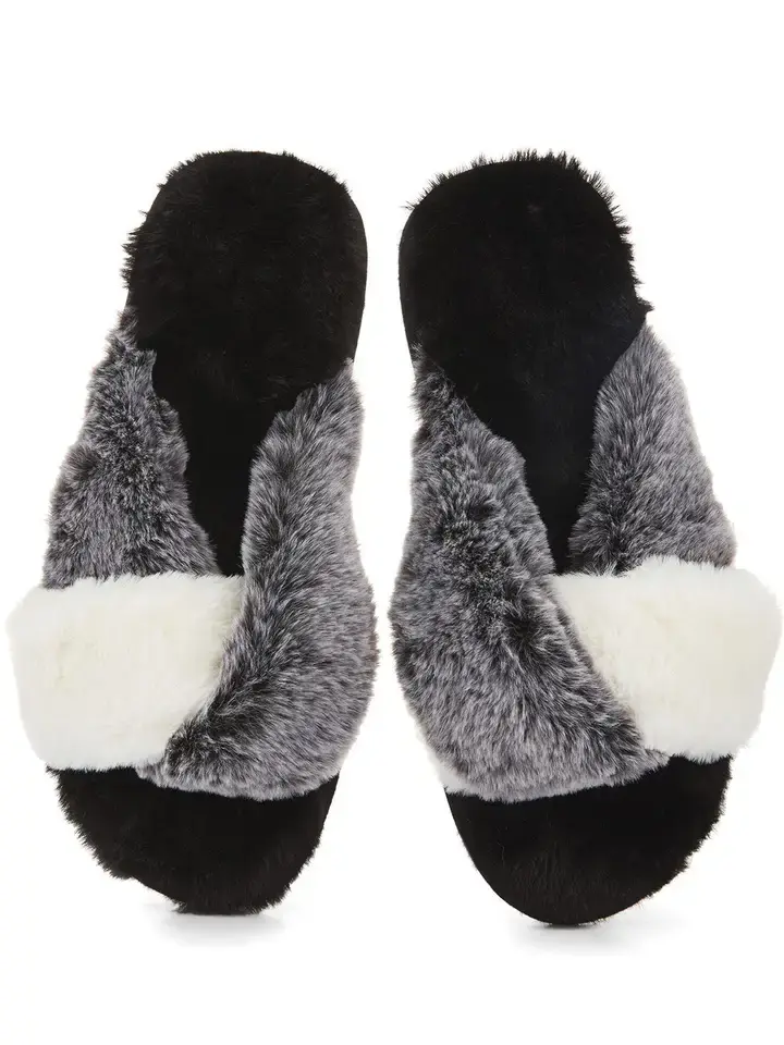 Our Rita Slippers combine classic Hollywood starlet fashion with high quality comfort for a pair of slippers you'll always want to wear. This multi-tonal open toe pair has a memory foam insole and is covered in plush faux fur in a looped halter design that gives visual intrigue as well as a perfect finishing touch. Available in multiple colors - makes a great gift!
